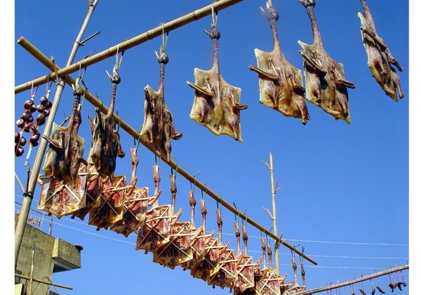 林畬板鴨,亦稱(chēng)臘鴨,以其色澤誘人、肉厚質(zhì)韌,口味香郁,肥而不膩在清流素有美譽(yù)。林畬板鴨的制作工藝要求極嚴(yán),用來(lái)制作板鴨的必須是在田野溪流中放養(yǎng)的鴨子,一般采用胡鴨,當(dāng)?shù)厝艘步胁锁啠猿缘竟葹橹鳎簿褪侨藗兂Uf(shuō)的“土鴨”。這類(lèi)鴨子需喂養(yǎng)百日方能上市,肉質(zhì)好有韌性。 鴨子喂養(yǎng)三個(gè)月后,挑選體重在三斤半到四斤重的鴨子,用開(kāi)水褪毛開(kāi)膛,去除內(nèi)臟,沖洗干凈內(nèi)腔,砍去鴨爪、翅尾,吊起瀝干水分。待瀝下的水滴稀少,且基本無(wú)血色時(shí)取下,用食鹽在鴨身內(nèi)外揉搓,使食鹽均勻地布滿(mǎn)鴨身、內(nèi)腔。其中大腿、胸部?jī)膳约∪狻挪康犊诤涂谇粌?nèi)都要用鹽擦透。在鴨腿上擦鹽時(shí),要將肌肉由下向上推,使肌肉受壓,與鹽容易接觸。然后灑上胡椒粉、辣椒粉、味精等腌制三到五天,使其入味。撈起,將鴨背向上、腹朝下、頭向里、尾朝外放在案板上,用雙手使勁在胸骨部位下壓,將胸部前面的三叉骨壓扁,使鴨體呈扁長(zhǎng)方形。用事先準(zhǔn)備好的三根竹片,兩根交叉,一根橫向?qū)Ⅷ喩頁(yè)伍_(kāi)、固定,使其在晾曬過(guò)程中不易變形,晾曬二十天后即可上市。 由于“土鴨”上市量遠(yuǎn)遠(yuǎn)不能滿(mǎn)足加工的需求,林畬板鴨多采取家庭作坊式加工經(jīng)營(yíng),只有春節(jié)前后的幾個(gè)月才是生產(chǎn)銷(xiāo)售旺季,這就造成了“林畬板鴨”平時(shí)少人問(wèn)津,旺季又供不應(yīng)求的狀況。正是由于這種獨(dú)特的制作工藝和對(duì)原料鴨的特殊要求,限制其大規(guī)模生產(chǎn)。加上口味缺少變化,未注重包裝,因此目前板鴨的銷(xiāo)售主要局限于本縣及鄰近區(qū)域,改進(jìn)包裝、強(qiáng)化創(chuàng)新和宣傳,是其扣響全省乃自全國(guó)市場(chǎng)的必由之路。(曾嫦姍) |