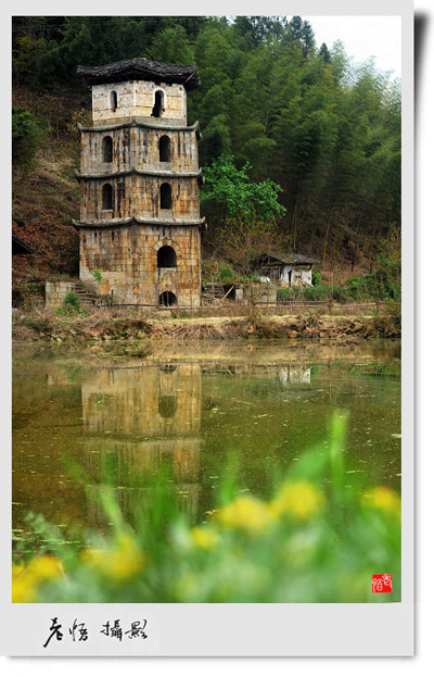 溫郊梧地海會塔 一條溪流蜿蜒穿行小村,沿著水渠,走過李氏祠堂、穿過木制風雨橋、走近一座磚石結構的五層心靈歸屬之處海會塔。 觀望此處,風光絕好,塔前左右兩口水井,雖已枯涸,卻也是此塔點睛之筆,最為獨特所在;往前十數米,一洼池塘,水清凜冽,云彩倒映其中,絕對的波光云影共徘徊,鵝鴨游弋過處,水波潾潾,毫光四射;再往前,田疇阡陌,綠野了然,左為梧地小學,右乃李氏宗詞;正前方,民居鱗次櫛比,房前屋后,果樹成林,雞犬之聲,不絕于耳,母喚兒歸,悠悠然然。 塔后山崗,看似荒禿,然山勢走向,有如龍蛇,逶迤蟄伏,只待時機,一飛沖天!塔右風雨橋,又名西湖橋,周遭竹樹環繞,清風徐來,泉聲陣陣,好一處休閑勝地。