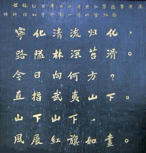 1929年12月28日 至29日,毛澤東與朱德、陳毅在上杭縣古田村領導召開紅四軍第九次黨代表大會。此時,蔣介石組織廣東、福建、江西三省國民黨軍隊對閩西革命根據地實行“三省會剿”,并已進至龍巖、上杭、長汀一線,形成對紅四軍包圍態勢。為打破敵軍“三省會剿”,紅四軍前委決定由軍長朱德率紅四軍主力一、三、四縱隊離開古田,跳出敵軍包圍,前往連城縣境籌款;留下二縱隊由毛澤東指揮,在龍巖方向掩護主力行動。 1930年1月7日,朱德在連城獲悉江西“會剿”軍已跟進到連城,隔斷了紅四軍主力與二縱隊的聯系,決定率部離開閩西,經清流、寧化縣境翻越武夷山,進軍江西,以吸引江西“進剿”軍離閩回贛。毛澤東率二縱隊在龍巖縣小池完成阻敵任務后,立即向連城方向轉移,準備與主力會合,途中得知朱德已率一、三、四縱隊向寧化方向前進,從連城姑田余家畬出發,連夜追趕, 經清流的沙蕪洞口,余朋,芹溪,溫郊,過林畬往明溪。在途經清流沙蕪洞口時,毛澤東站在高高的白馬山上,放眼一波碧水,遠望茫茫蒼蒼的群山,回首走過的曲曲折折山路,心潮澎湃,詩興大發,吟就這首詞: 《如夢令·元旦》 寧化、清流、歸化, 路隘林深苔滑。 今日向何方, 直指武夷山下。 山下山下 風展紅旗如畫。 詞中反映了行軍途中環境的惡劣、行進的艱難,以及寧化、清流、歸化一帶革命活動開展如火如荼的生動景象,表現出昂揚的斗志和革命必勝的樂觀主義信念。 1月15日部隊經過林畬,在塘堀村駐扎,部隊戰地指揮所設在邱姓人家一幢祖房內,此房為三進大屋,毛澤東同志住宿上廳廂房,右廂房住警衛干部、下廳警衛連,中廳為部分首長住宿。紅軍在當地刷寫標語、召開群眾大會,辦工農夜校,教群眾學文化,宣講革命道理,發動群眾參加紅軍。并為當地百姓挖了兩口井,以解決生活、生產用水困難的問題,林畬現尚存留有紅軍七師一團、紅軍十二團、紅軍人民等單位標語十幾條,以及紅軍醫院、紅軍夜校、紅軍井、紅軍橋、紅軍烈士墓等革命遺跡。紅軍在林畬播下革命火種,當地群眾的革命熱情空前高漲,他們為紅軍籌糧籌款,婦女們紛紛將自己親手納的布鞋送給紅軍,青年男女踴躍參加紅軍,出現一幕幕父母送郎、婦女割掉髻子當紅軍,夫妻雙雙上戰場的感人畫面。后 毛澤東率二縱隊經歸化(今明溪)、寧化,行軍翻越武夷山時,正值下雪天,寒風怒號,飛雪撲身,連綿高山銀裝素裹,縱橫溝壑林深苔滑。毛澤東與戰士們一樣冒雪艱難行進。 1930年1月19日入江西廣昌縣境,20日在廣昌赤水擊潰廣昌靖衛團,活捉國民黨廣昌縣長, 23日抵達寧都縣東韶與朱德率領的一、三、四縱隊會合。(曾嫦珊) |