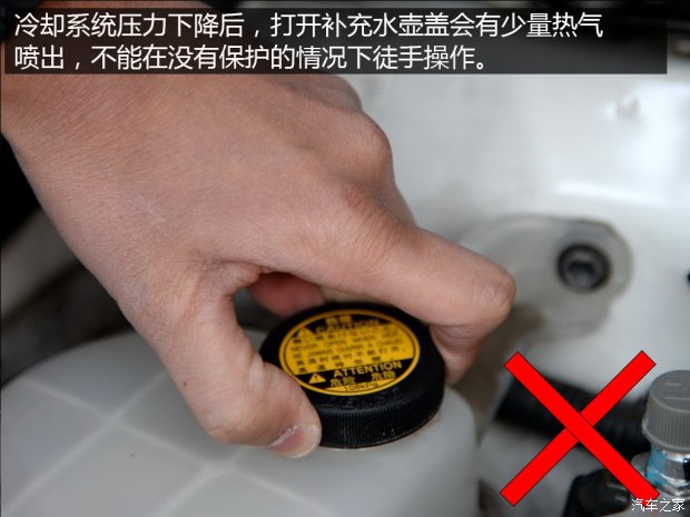 當冷卻液達到正常工作溫度時,正確補充冷卻液方法是先滅車,等待一會后上水管壓力會降低,在非之前的緊繃狀態后,用布或手套之類的東西墊在補充水壺蓋上,慢慢旋轉擰開,到有氣體噴出時停止旋轉,帶到氣體完全釋放后就可以擰開壺蓋,補加冷卻液了。