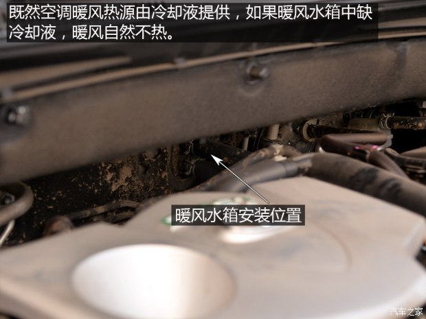 從發動機倉內部就能看到暖風水箱的位置,有些車型暖風水箱位置會高于缸體,和缸蓋持平或高于缸蓋,這樣就保證在冷卻液不足的情況下優先使冷卻液在缸體、缸蓋中循環,補足冷卻液后,暖風水箱中充滿滾燙的冷卻液,暖風自然會熱起來。