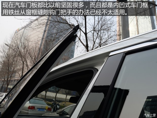 掰車門框用鐵絲鉤 已經不適用 在論壇里很多車友應對鑰匙被鎖車內是把窗框掰出縫隙后用鐵絲鉤門把手或中控鎖的方法。這種辦法應對一些低端車型或許有效,這些車的門板較薄,比較容易掰出縫隙。但目前大部分車型門板都相比以前堅固了很多,而且幾乎都是內凹式門框,很難將窗框掰出縫隙,一旦把門板掰變形,下雨或洗車時車內必然進水,這種方法不建議使用。