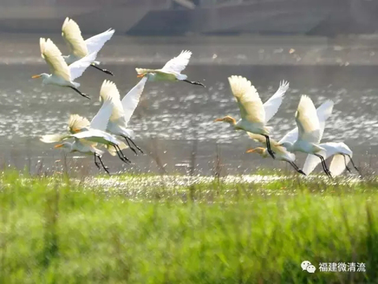 金風(fēng)浮白鷺,綠水浣紅霓。