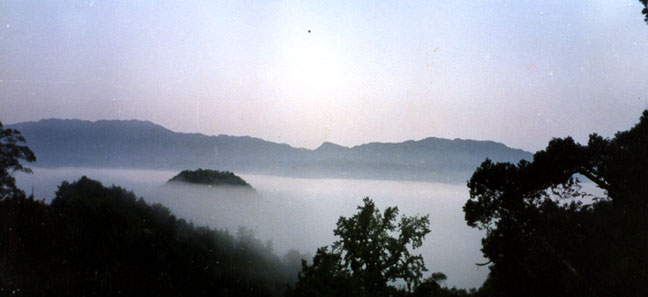 你看了廟,拜了佛,還意猶未盡,可住宿下來,早看云海升,晚觀紅霞飛。尤其在夏秋兩季的早晨,或是在雨后天晴的時(shí)刻,山霧似紗似云,從河面從山腳一團(tuán)團(tuán)、一簇簇地涌向山腰,飄過山頂,村落、山野若隱若現(xiàn),人們似乎在云中,仿佛在天上,進(jìn)入了傳說中的仙境。傍晚,夕陽有些依依不舍,從大佛對(duì)面的山頂上慢慢西去,象位出嫁的大姑娘,在云中一步三回頭,漲紅著臉,把周邊的云朵先染成粉紅,再染為紫紅、橘紅,大朵的象她紅色的棉襖,長條的象她飄逸的絲巾,鱗狀的象她圍裙上的花朵,把山巒、村莊也染得姹紫嫣紅。這時(shí),你也許有追隨她而去的念想,但別忘了,你還在佛山中。(巫仕鈺) |