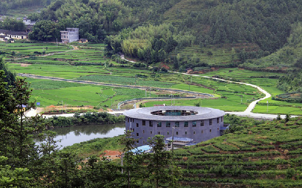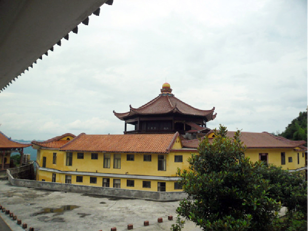 跨過馬都堂迎賓大橋,即來到客家博物館。這座酷似永定土樓的博物館,灰面青瓦,呈圓柱狀,外實(shí)內(nèi)空,是客家人非方即圓建房筑屋的典型代表。過去,客家人喜按姓氏群聚而居,建的房子大多是方正的圍屋,圓形的土樓較少,但他們卻具有一個(gè)共同特點(diǎn),就是便于抵御外敵,這對(duì)于從中原顛沛流離而來,僑居荒蠻南夷之地的客家人來說,不為是上上之選,我們不得不感嘆客家先人的膽識(shí)和智慧。博物館裝修已近尾聲,將用來詮釋客家民系形成的歷史,展示客家人長期積淀的文化和民俗,重現(xiàn)客家人過去生活生產(chǎn)的場景。 又走五十米,就到了中華客家祖山門樓。門樓用大理石構(gòu)筑而成,有五孔共四層,高大雄偉,門柱上嵌刻了形意雋永的名家楹聯(lián),未近已聞書香;門頂飛檐斗拱好似祥云朵朵在飄,還好有六副石門當(dāng)壓得結(jié)結(jié)實(shí)實(shí),不用心驚,盡管放馬前行。過了門樓,順著上山水泥路拐幾個(gè)彎,約摸一公里就到了定光寺。定光寺依山而建,三梯布局,杏黃色的墻,青灰色的脊,氣勢(shì)宏偉,由祖山禪院、大雄寶殿、定光殿組成。定光殿雖未建成,但左有設(shè)施齊備的廂房,右有微派的客家素食館,已食住無憂,可盡性一游。