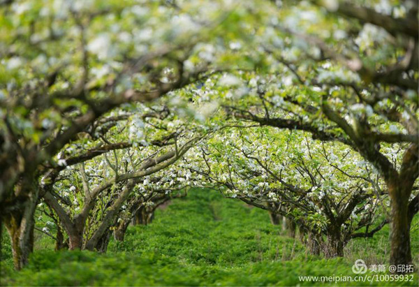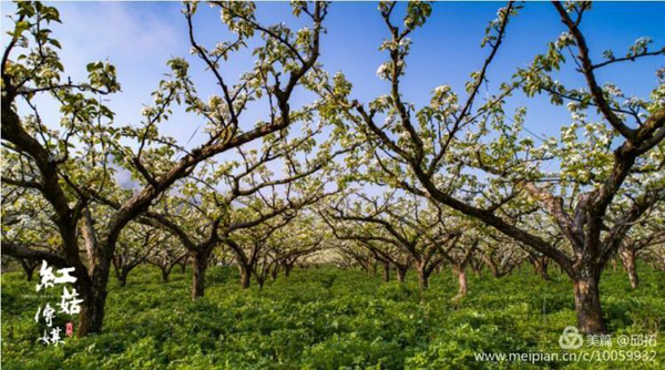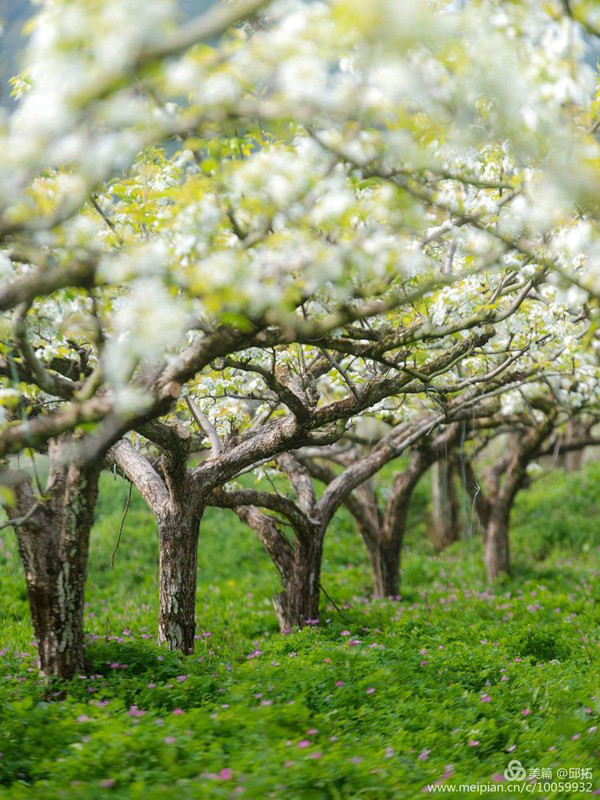 晶瑩透白的梨花瓣下,包涵了多少光鮮,綻放了多少期待,漫野的白花,鮮活、明媚、皓腕,以淡妝素裹揮灑出一幅多姿的畫卷。
