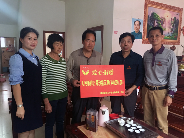 ????病魔無情,人間有愛。在得知黃峻烽病重的消息后,城關(guān)小學校領(lǐng)導班子積極倡導,準備募捐事宜。為動員更多的愛心人士參與募捐,學校少先大隊在校園內(nèi)發(fā)起了愛心捐款倡議書,在各中隊中進行宣傳,對隊員們進行思想動員。4月2日上午,為黃峻烽同學進行的“點點愛心,溫暖真情——愛心捐助活動”在清流縣城關(guān)小學校園操場上舉行。副校長巫朝明致儀式開幕詞,少先隊輔導員賴艷蓉老師再次宣讀了倡議書,全校教職工、全體學生參與了此次募捐活動,紛紛伸出援助之手,慷慨解囊,把一顆顆濃濃的關(guān)愛之心送入募捐箱中。最后,校長吳施彬作了總結(jié)發(fā)言,他感謝積極參與募捐活動的愛心人士,囑咐同學們以愛心待人,繼續(xù)發(fā)揚中華民族優(yōu)秀傳統(tǒng)。此次愛心捐助活動共募捐了40090元,當天下午就把募捐款送到患者家中。
