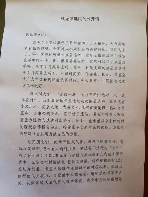 自村級組織換屆選舉工作啟動以來,清流縣認真貫徹上級部署,科學謀劃,在從嚴從實推進換屆選舉各個環節的同時,明確各時期的宣傳重點,立足當地實際,采取各種形式,全力開展宣傳造勢,并以換屆試點林畬鄉為重點,結合掃黑除惡、移風易俗、扶貧攻堅等工作,通過鄉村干部走村入戶、張貼通告及通過微信、短信、宣傳單等方式,在全縣各鄉鎮公開欄、集貿市場等人流密集區域以及各建制村、自然村、社區等村民集中場所張貼換屆紀律《通告》700多份,發放手機短信20多萬條。各鄉鎮也結合實際,讓廣大黨員群眾知曉村級換屆選舉相關政策法規,從一開始亮明底線和紅線,為村級換屆選舉工作營造良好的輿論氛圍。