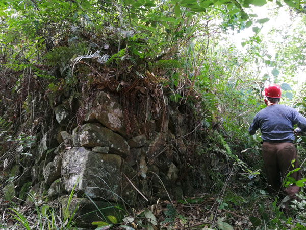 我們從縣糧食倉(cāng)庫(kù)邊上繞道,沿武警大隊(duì)圍墻外,順著山脊而上山。行走約200米后,往右翼一條上山小道婉延而上。沿路盡是殘墻斷壁掩映在綠樹(shù)之中,石砌臺(tái)階時(shí)而可見(jiàn)時(shí)而埋入泥土中。繼續(xù)往上攀登約100米,映入眼簾的是綿延的古城墻、戰(zhàn)壕和殘墻處處,這處地平坦開(kāi)闊,有疑似兵器儲(chǔ)備庫(kù)遺址、有瞭望臺(tái)遺址、有屯兵遺址和練兵場(chǎng)遺址等等,登高眺望,清風(fēng)徐來(lái),令人心曠神怡。 向?qū)гB生(72歲)介紹說(shuō):“往南面看到的山嶺,當(dāng)?shù)厝朔Q(chēng)上鵝嶺,現(xiàn)在叫南極山,可通寧化縣謝坊、安樂(lè),以及連城縣長(zhǎng)汀縣等地;南隘也稱(chēng)下鵝嶺,武警大隊(duì)位置本地人稱(chēng)是簍簧嶺;簍簧嶺上方靠近南隘叫作天子地,以前的戰(zhàn)壕依稀可見(jiàn)。解放前,這里被飛機(jī)炸毀。以前的人不識(shí)飛機(jī),有青年看到飛機(jī)飛來(lái),站在戰(zhàn)壕上向飛機(jī)指手劃腳打招呼,結(jié)果飛機(jī)扔下炸彈,炸死好多人。后來(lái)過(guò)了好久,才知道是國(guó)民黨的飛機(jī)?!比缃竦哪习?,東面以樟樹(shù)為多,還有人在樹(shù)枝上系上紅綢,有人許愿還愿的;山腳下就是有許多傳奇故事的樊公潭,也就是城區(qū)水口位置,可通達(dá)龍津鎮(zhèn)的橫口、大橫溪等村莊,嵩口鎮(zhèn)、田源鄉(xiāng)、靈地鎮(zhèn)和李家鄉(xiāng)等鄉(xiāng)鎮(zhèn),外接龍巖地區(qū),是古時(shí)候的官道,水路必經(jīng)之地;南面以松樹(shù)、雜樹(shù)、灌木為主,西面以低矮雜樹(shù)為主,北面以低矮松樹(shù)、杉樹(shù)和毛竹為多。