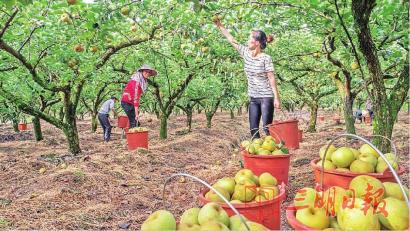 7月5日,清流縣嵩口鎮(zhèn)圍埔村1200畝高標(biāo)準(zhǔn)優(yōu)質(zhì)水果臺灣蜜雪梨已經(jīng)成熟,工人正在采摘。 近年來,圍埔村村民利用土地資源優(yōu)勢,通過采取股份制形式,合作參與新一輪高起點的農(nóng)業(yè)綜合開發(fā),種植推廣1200畝高標(biāo)準(zhǔn)“三蜜”優(yōu)質(zhì)水果,其中臺灣蜜雪梨450畝、水蜜桃500畝、特早蜜250多畝。目前,臺灣蜜雪梨已進(jìn)入盛產(chǎn)期,預(yù)計今年可產(chǎn)蜜雪梨50萬公斤。 (林旭煌 攝)