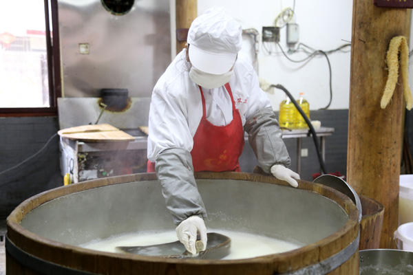 “鹵水點豆腐,一物降一物”。走進上青鄉崇際村的“豆腐文化體驗館”,泰寧上青游漿豆腐制作技藝傳承人陳小輝卻告訴記者,“上青游漿豆腐不用鹵水、不用石膏,只采用豆腐樹葉子熬制而成的陳漿和本地非轉基因黃豆制作,口味濃郁醇厚,口感細膩順滑,是純天然、無添加的綠色食品”。 陳小輝,今年45歲,祖孫三代都做豆腐,他已經和豆腐打了30年的交道,目前帶有6個徒弟。