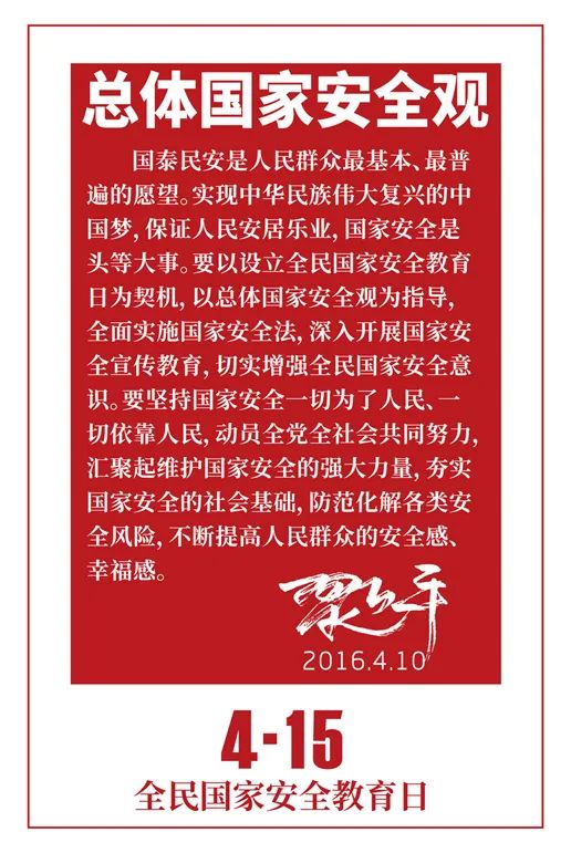 今年4月15日是我國的第五個(gè)“全民國家安全教育日”,今年國家安全教育日的活動(dòng)主題為“堅(jiān)持總體國家安全觀,統(tǒng)籌傳統(tǒng)安全和非傳統(tǒng)安全,為決勝全面建成小康社會(huì)提供堅(jiān)強(qiáng)保障”。