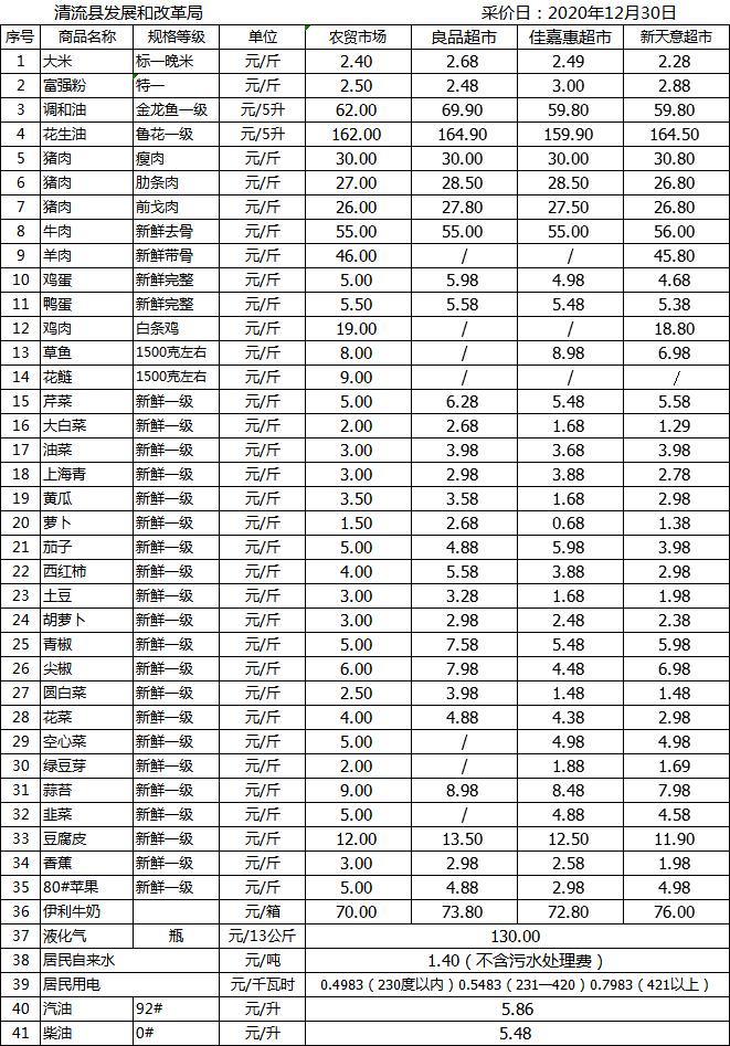 清流縣民生價(jià)格行情(采價(jià)日:2020.12.30)