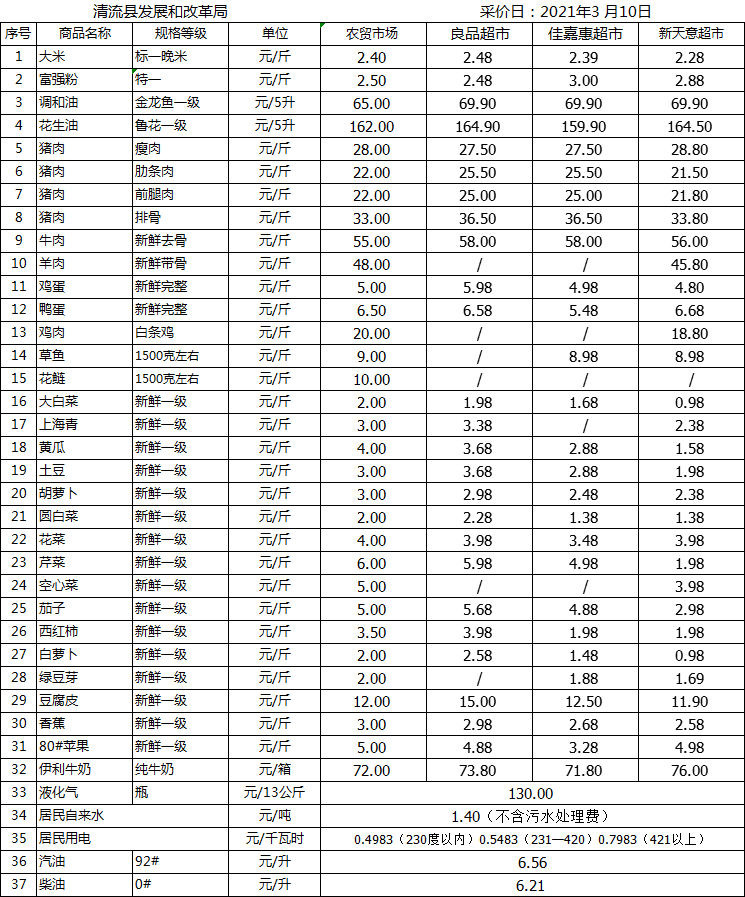 清流縣民生價(jià)格行情(采價(jià)日:2021.03.10)