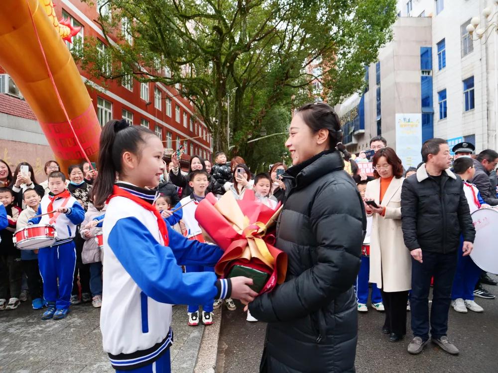 在葛曼棋的母校清流縣城關小學,師生們手舉花束、紅旗,列隊歡迎。