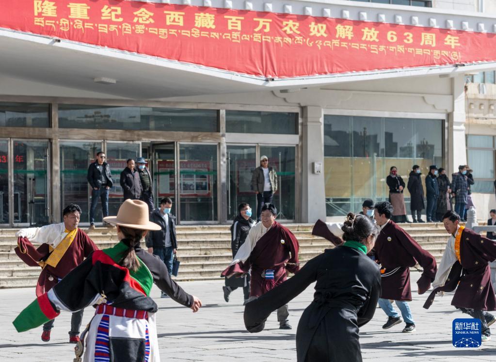 3月28日,那曲市群眾在慶祝活動上跳起鍋莊舞。 當日,西藏那曲市舉行活動,慶祝西藏百萬農奴解放紀念日。 新華社記者 周荻瀟 攝