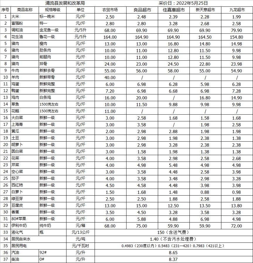 清流縣民生價格行情(采價日:2022.05.25)