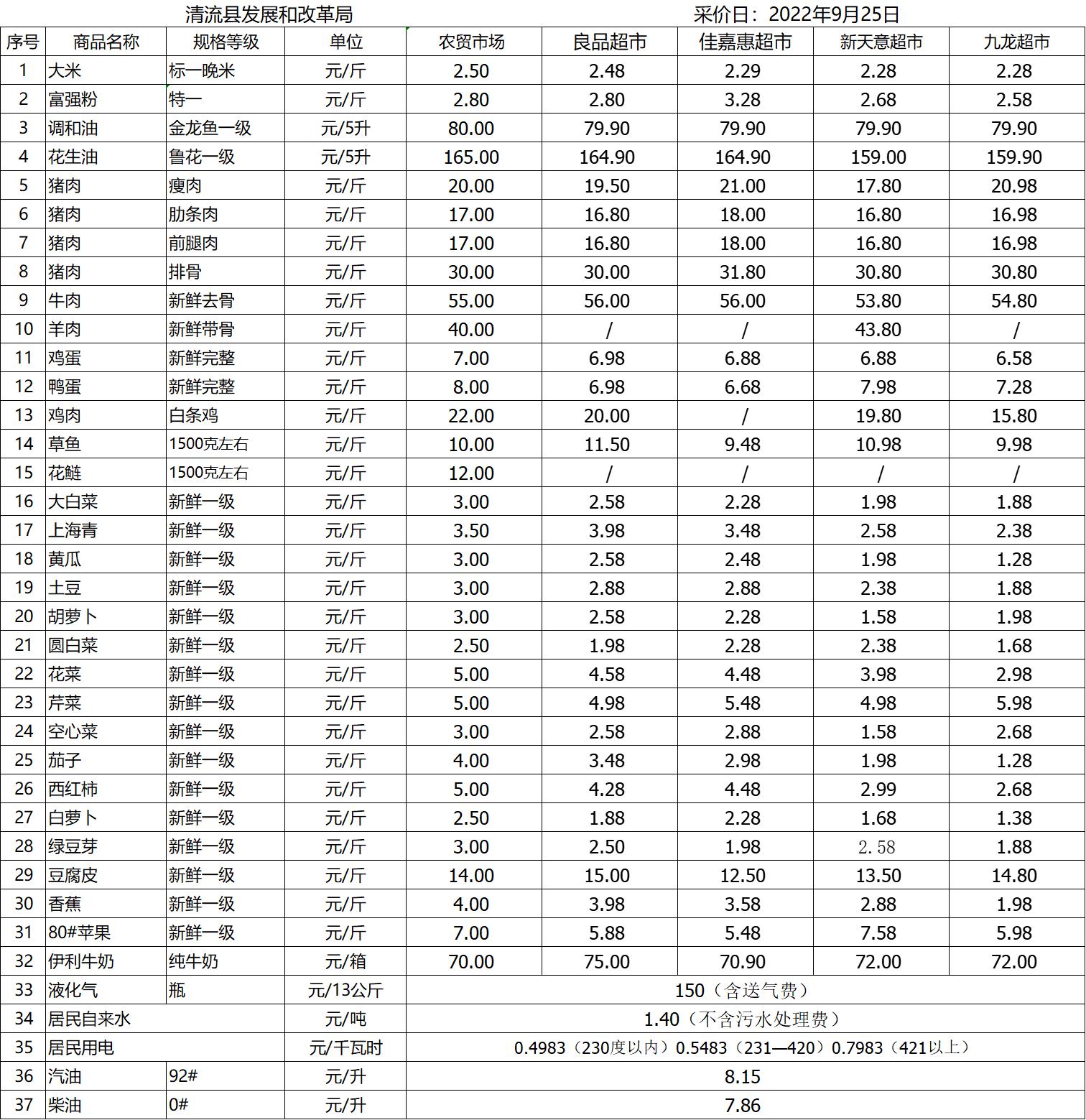 清流縣民生價格行情(采價日:2022.09.25)