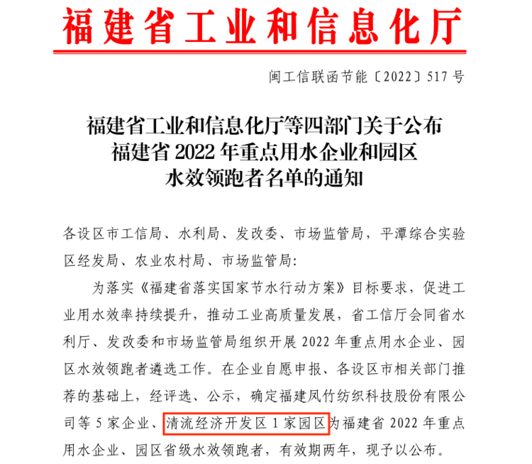 日前,福建省工業和信息化廳公示公布了2022年第五批省級綠色制造名單和2022年重點用水企業和園區水效領跑者名單。清流經濟開發區獲評福建省“綠色園區”和福建省2022年”水效領跑者”,福建省展化化工有限公司和清流縣博鑫光電材料有限公司獲評省級“綠色工廠”。