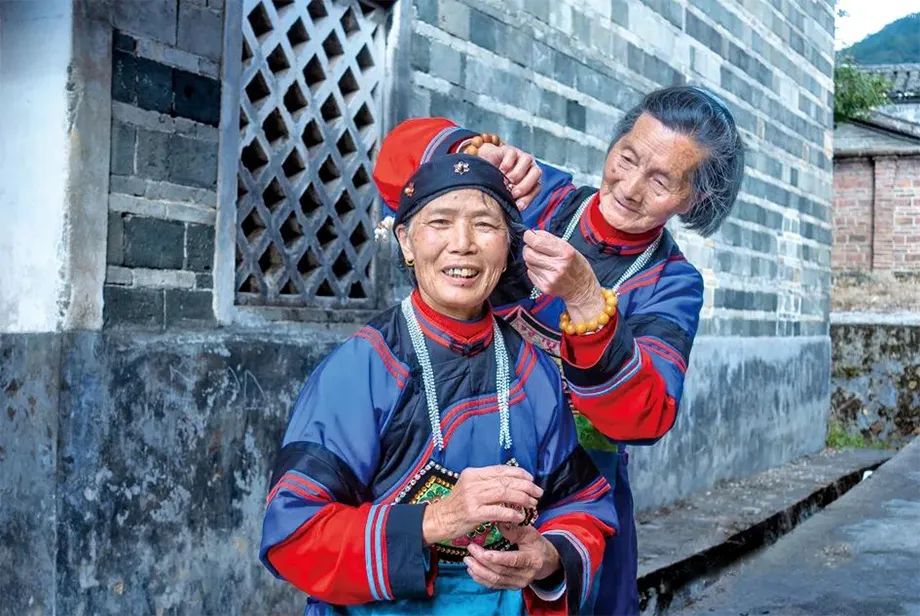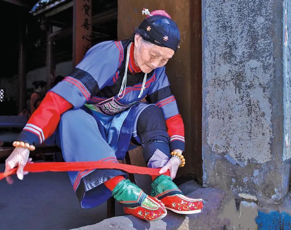 清流縣長(zhǎng)校鎮(zhèn)省級(jí)非遺項(xiàng)目客家服飾傳承人——馬玉英(中間)等在展示傳統(tǒng)服飾(曹建平攝) 流動(dòng)的客家風(fēng)景線 過去,行走在清流縣長(zhǎng)校鎮(zhèn)的主街道上,總能看到一位滿頭銀發(fā)的老嫗坐在自家門口。老嫗梳著一頭絲絲平整的發(fā)髻,穿一身寬博的大襟衫,衣長(zhǎng)及膝,下身著七分大襠褲,三分之一小腿及腳踝處用紅繩一圈繞著一圈系綁著客家“水褲”,其實(shí)是一塊鑲有緄邊的帕子,穿時(shí)把其中一角覆于腳面,其余部分用紅布條系綁在小腿及腳踝處,具有襪子的功效。除此外,她還手戴“竹節(jié)鐲”,腳著尖嘴繡花鞋。當(dāng)?shù)貙?duì)此裝飾有一順口溜:“頭上梳起龍船髻,腳上穿著尖咀鞋,大邊小鑲‘士林藍(lán)’,金環(huán)銀鐲響當(dāng)當(dāng)。”——這就是典型的客家服飾。 唐宋時(shí)期,客家人從中原遠(yuǎn)道遷徙而來,他們不僅帶來生產(chǎn)生活方式的進(jìn)步,也帶來了完全不同的民俗、風(fēng)俗。長(zhǎng)校客家傳統(tǒng)服飾,就是在這個(gè)時(shí)期的民族交融中,形成的頗具地方特色的服飾,時(shí)近千年幸得尚存。 “以前,只要看到我們的穿著,大家就知道我們是客家人,這是我們身份的標(biāo)識(shí)。”馬玉英是長(zhǎng)校客家服飾制作技藝的傳承人之一,她介紹,大襟衫多以藍(lán)、黑色棉麻布料為主,樣式又長(zhǎng)又寬,輔以圍身裙束腰,斜襟側(cè)開,全衣只7個(gè)盤扣,其袖口、領(lǐng)口處會(huì)配以不同顏色的緄邊,且在早期制作中,大量吸收畬族服飾緄邊刺繡手法,色彩對(duì)比強(qiáng)烈,手藝好的女性,還會(huì)在圍裙上縫上一面自己的手繡。寬大的袖口往上反卷,用暗扣或縫線固定,稱為“反袖口袋”,因此還需配一截一尺長(zhǎng)小袖子,臨時(shí)用針別在大袖口內(nèi),方便撤下洗換。 鄒春仙:13歲學(xué)習(xí)藍(lán)衫裁縫技藝 鄒春仙是清流長(zhǎng)校客家服飾制作技藝的另一位傳承人,是長(zhǎng)校鎮(zhèn)的客家藍(lán)衫裁縫。 她說自己的技藝是從父親和姐姐那里學(xué)的。她記得自己13歲那年,一放學(xué)回到家,就得幫忙家里做藍(lán)衫的布扣。別看小小一個(gè)布扣不起眼,扭結(jié)的過程需要花費(fèi)大力氣才抽得緊,成型后還要用重物敲擊打緊,這樣打制出來的布扣才圓潤(rùn)、飽滿、耐用。 “我們做布扣很注重‘出頭’。”鄒春仙說,打制出的布扣紐頭上有八個(gè)和九個(gè)結(jié)眼的差別,九眼的更飽滿結(jié)實(shí),客家人喜歡用九眼,聽長(zhǎng)輩們說九眼的頂端多出一個(gè)結(jié)頭,有“出頭”的涵義。 “做藍(lán)衫褲,不需要很準(zhǔn)確的量身,對(duì)穿的人沒有很嚴(yán)格的要求,不管高矮胖瘦都可以穿,所以,有時(shí)候一件好的藍(lán)衫,可以穿很久,甚至還可以母女相傳。”鄒春仙告訴筆者,整體裁剪制作起來不難,最難的是藍(lán)衫的裝飾。