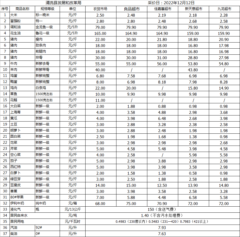 清流縣民生價(jià)格行情(采價(jià)日:2022.12.12)