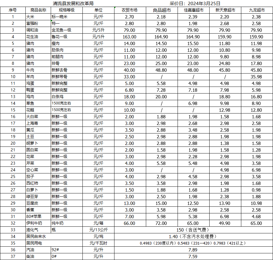 清流縣民生價格行情(采價日:2024.03.25)