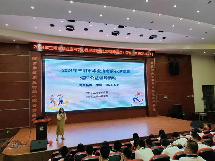 為進一步緩解高三學生考前心理壓力,放松身心,幫助學生以良好的精神面貌和積極的心理狀態迎接高考, 4月21日晚上,三明市畢業班考前心理健康巡回公益輔導活動受邀到我校開展活動。由三明二中優秀心理教師廖紅玉為高三學生開設了題為《乘風破浪逐夢前行》考前心理減壓賦能專題講座。