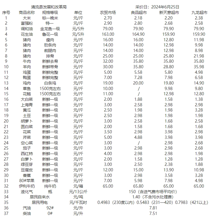 清流縣民生價格行情(采價日:2024.06.25)