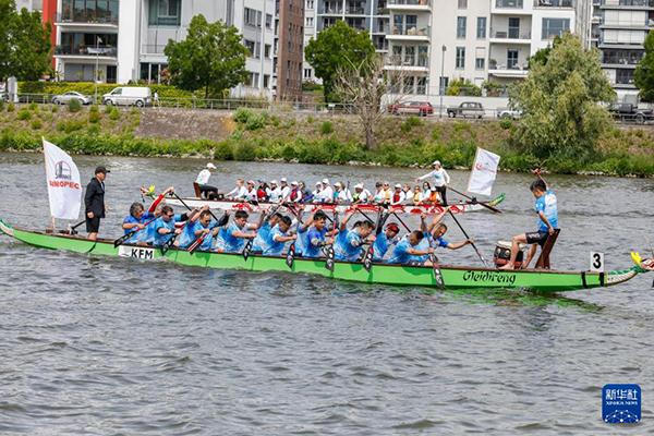 5月24日,人們在德國法蘭克福美因河上參加龍舟比賽。 為迎接中國傳統(tǒng)節(jié)日端午節(jié),海外多地近日舉行龍舟比賽等活動,讓民眾體驗到多元文化交融的魅力。 新華社記者 張帆 攝