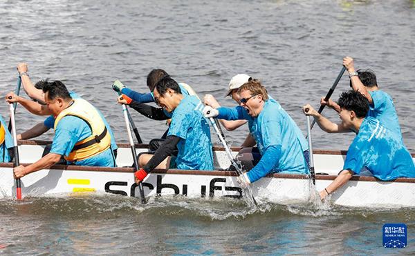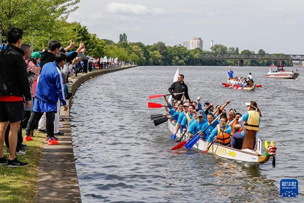 5月24日,在德國法蘭克福,龍舟隊隊員與岸上觀眾互動。 為迎接中國傳統(tǒng)節(jié)日端午節(jié),海外多地近日舉行龍舟比賽等活動,讓民眾體驗到多元文化交融的魅力。 新華社記者 張帆 攝