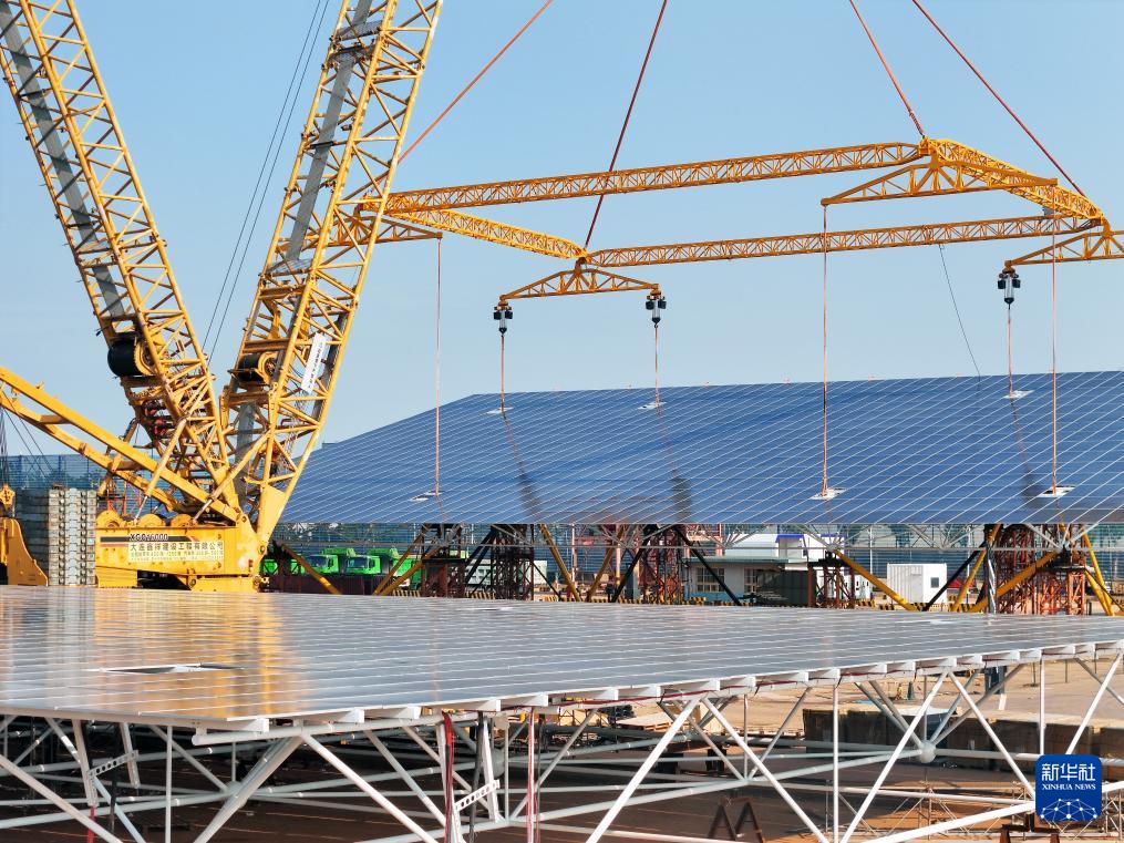 6月16日,在山東港口煙臺(tái)港萊州港區(qū),起重機(jī)在裝配大型鋼桁架海上光伏平臺(tái)(無(wú)人機(jī)照片)。5月份,全國(guó)規(guī)模以上工業(yè)增加值同比增長(zhǎng)5.8%。新華社發(fā)(唐克攝)