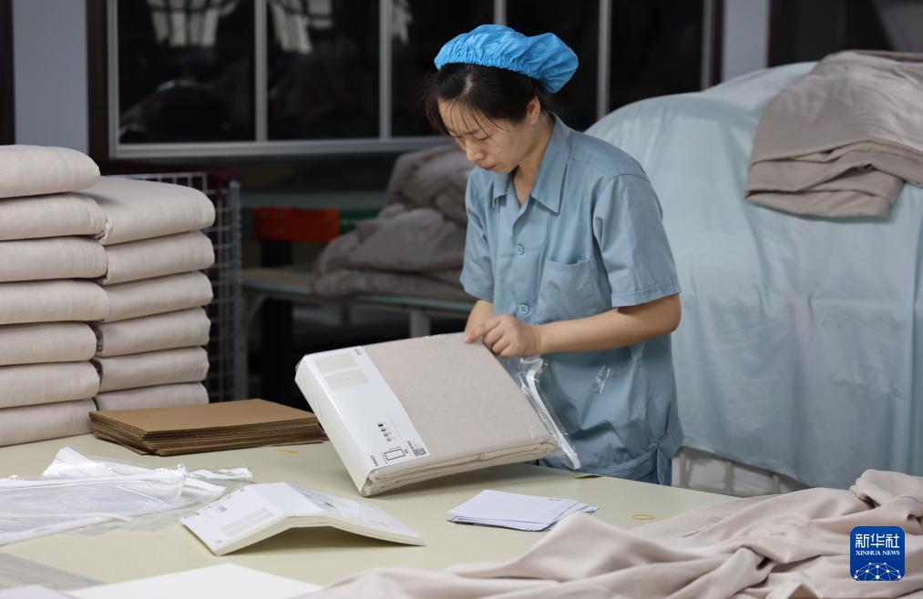 6月16日,在山東濱州高新區(qū)小營(yíng)街道的一家紡織企業(yè)生產(chǎn)車(chē)間內(nèi),工人加緊趕制紡織品的海外訂單。5月份,貨物進(jìn)出口總額38098億元,同比增長(zhǎng)2.7%。新華社發(fā)(初寶瑞攝)