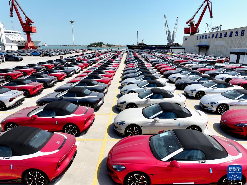 6月16日,在江蘇省連云港港東方港務(wù)分公司碼頭,大批車(chē)輛等待裝船外運(yùn)(無(wú)人機(jī)照片)。5月份,貨物進(jìn)出口總額38098億元,同比增長(zhǎng)2.7%。新華社發(fā)(王春攝)