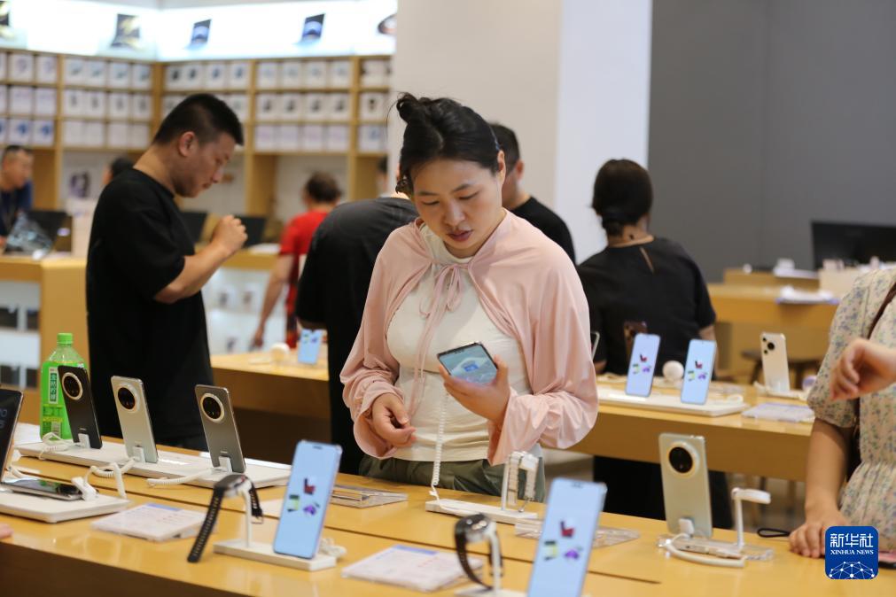 6月15日,顧客在四川省樂(lè)山市一大型商場(chǎng)內(nèi)挑選新款手機(jī)。5月份,社會(huì)消費(fèi)品零售總額41326億元,同比增長(zhǎng)6.4%,比上月加快1.3個(gè)百分點(diǎn)。新華社發(fā)(李華時(shí)攝)