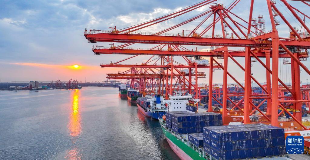 6月16日,輪船停泊在河北唐山港京唐港區(qū)集裝箱碼頭作業(yè)(無(wú)人機(jī)照片)。5月份,全國(guó)規(guī)模以上工業(yè)增加值同比增長(zhǎng)5.8%。新華社發(fā)(劉滿倉(cāng)攝)