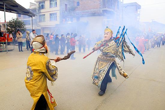 五經魁巡游 “五經魁”一年出演兩次,正月初三叫“經魁出行”,給鄉親拜年;正月十四是當地廟會,“五經魁”再次巡演,巡演隊伍后面多了鎮武祖師神像、花籠以及嗩吶、十番鑼鼓伴奏隊。所到之處,沿途戶主均焚香鳴炮迎接,并贈送紅包。巡演在李村、鮮水、河背三個村之間進行,全程20里。“五經魁”淵源久遠,寓意獨特,歷久不衰,扮演者服飾色彩豐富,邊走邊對舞,舞姿優美,動作利落,配合默契,倍受鄉親歡迎。2007年8月,清流李家五經魁入選福建省第二批非物質文化遺產名錄。 |