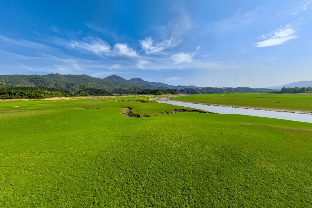 每年四月中旬,清流縣沙蕪鄉九龍湖沉睡的湖面便會轉換形態,鋪陳出一片片綠色的絨毯。藍天陽光下,無垠的綠野,滿是生機和自由。遼闊綠色的天地間,等風來、追風去,大口呼吸、擁抱自由。