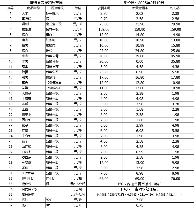 清流縣民生價格行情(采價日:2025.09.10)
