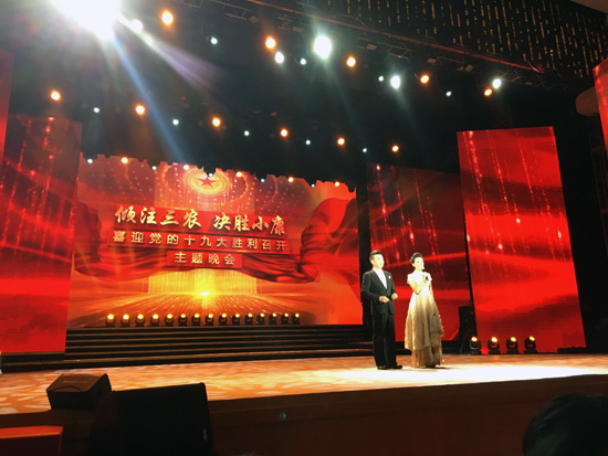 晚上7點30分,情景演唱《決勝小康》拉開了晚會的序幕。整臺晚會主題旋律突出、小康特色濃郁,時代特點鮮明、情感真實、氣氛熱烈、精彩紛呈。通過歌舞、小品、表演唱、情景劇、微型相聲、評書、朗誦、專題、音詩畫等藝術形式,充分展示了黨的十八大以來,億萬人民在以習近平同志為核心的黨中央的堅強領導下,并肩攜手、城鄉同行,全面推進建成小康的精神風貌;真實展現了脫貧攻堅成果、生態文明建設、特色小鎮發展、供給側結構性改革、現代農業加快發展、新農村建設扎實推進、農村民生極大改善、社會安定祥和的良好局面;謳歌了決勝小康進程中涌現出的先進單位和先進個人事跡;熱情表達了億萬人民對實現全面建成小康社會宏偉目標和實現中華民族偉大復興的中國夢堅定信心和美好愿望。